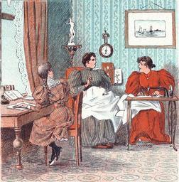| Keywords: PUK1894no45.jpg En datter laver lektier imens moderen og en syerske syr i et hjem i 1894 a daughter make piece of homework all the while the mother and a seamstress sew in a home in 1893 From the danish magazine Puk no 45 from 1894 PD-Art Mother and child in art Fashion in 1894 Sewing in art Women writing in art Sitting women in art Artworks missing infobox template Seamstresses in art |