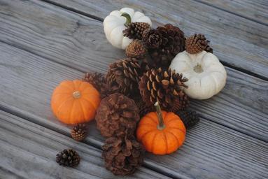 Keywords: pumpkin pine cone fall autumn thanksgiving season orange decoration arrangement festive natural nature harvest