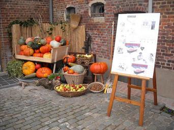 Keywords: pumpkins fruits nuts yellow autumn halloween still life composition vegetables broom