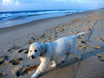Keywords: puppy coast sand waves blue white israel retriever dog pet animal beach sea cute fun outdoor canine doggy friend tranquil companion sweet sky
