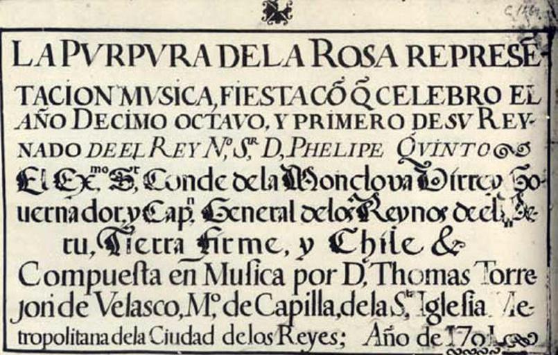 | Keywords: Purpura de la rosa score frontispiece.jpg  Frontispiece of the original score for La púrpura de la rosa 1701 by Tomás de Torrejón y Velasco 1644-1728 http //www memoriachilena cl/temas/documento_detalle asp id MC0032901 Memoria Chilena Dirección de Bibliotecas Archivos y Museos DIBAM 1701 Tomás de Torrejón y Velasco PD-old-100 Original upload log en wikipedia Purpura_de_la_rosa_score_frontispiece jpg wikitable Frontispiece of the original score for La púrpura de la rosa 1701 by Tomás de Torrejón y Velasco 1644-1728 Source http //www memoriachilena cl/temas/documento_detalle asp id MC0032901 Memoria Chilena Dirección de Biblio Uncategorized 2016 April 1 |