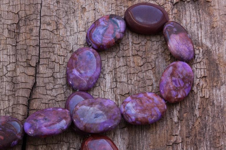 Keywords: purpurit mineral scaffolding silicate purple pink white gem stone tumbled smooth crystal structure linsenförmig jewellery