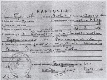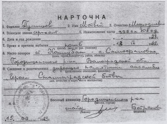 | Keywords: Putilov Matvei certificate from the archive 02.jpg ru Ка точка захо онения атвея ефодиевича Путилова погибшего п и обо оне Сталинг ада в 1942 году 2014-10-13 16 50 57 О игинал х анится в музее-заповеднике Сталинг адская битва Викто ия Вале ьевна Кохенде фе главный х анитель фондов музея-заповедника Сталинг адская битва Этот файл п едоставила для использования в википедии Викто ия Вале ьевна Кохенде фе главный х анитель фондов музея-заповедника Сталинг адская битва http //stalingrad-battle ru/ Сайт музея заповедника other versions cc-zero Battle of Stalingrad Documents in the Volgograd Panorama Museum People associated with World War II from the Soviet Union Putilov Matvei Mefodievich Uploaded with UploadWizard |