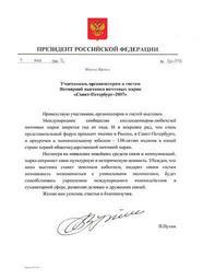 | Keywords: Putin Addresses St Petersburg Stamp Expo 2007.jpg en An official letter by Vladimir Putin in which he addresses the World Philatelic Exhibition «St Petersburg-2007» Signed on May 7 2007 ru Официальное п иветствие кото ое П езидент Российской Феде ации В Путин нап авил в ад ес участников о ганизато ов и гостей Всеми ной выставки почтовых ма ок «Санкт-Пете бу г 2007» Дати овано 07 05 2007 http //www russianpost ru/worldstamp/worldstamp/ru/home/press/greetings/greeting1 Presidential Press and Information Office 2007-05-07 PD-RU-exempt Vladimir Putin in 2007 20070121 Philatelic exhibitions Exhibitions in 2007 Exhibitions in Saint Petersburg |