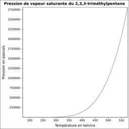 | Keywords: Pvs 2,3,3-triméthylpentane.svg fr Pression de vapeur saturante calculée d'après Robert H Perry et Donald W Green Perry's Chemical Engineers' Handbook McGraw-Hill USA 1997 7e éd 2400 p ISBN 0-07-049841-5 p 2-50 own Epop 2010-06-24 Created with Gnumeric Vapor-Liquid equilibrium curves |