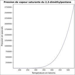 | Keywords: Pvs 2,3-diméthylpentane.svg fr Pression de vapeur saturante calculée d'après Robert H Perry et Donald W Green Perry's Chemical Engineers' Handbook McGraw-Hill USA 1997 7e éd 2400 p ISBN 0-07-049841-5 p 2-50 own Epop 2010-06-24 Created with Gnumeric Vapor-Liquid equilibrium curves |