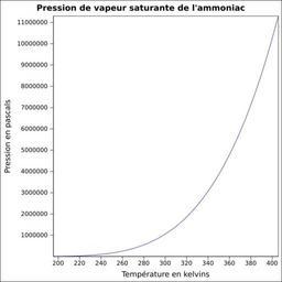 | Keywords: Pvs ammoniac.svg fr Pression de vapeur saturante calculée d'après <br/> Robert H Perry et Donald W Green Perry's Chemical Engineers' Handbook McGraw-Hill USA 1997 7e éd 2400 p ISBN 0-07-049841-5 p 2-50 own Epop 2010-06-24 Created with Gnumeric Vapor-Liquid equilibrium curves |