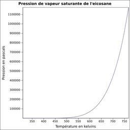 | Keywords: Pvs eicosane.svg fr Pression de vapeur saturante calculée d'après <br/> Robert H Perry et Donald W Green Perry's Chemical Engineers' Handbook McGraw-Hill USA 1997 7e éd 2400 p ISBN 0-07-049841-5 p 2-50 own Epop 2010-06-24 Created with Gnumeric Vapor-Liquid equilibrium curves |