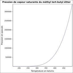 | Keywords: Pvs méthyl tert-butyl éther.svg fr Pression de vapeur saturante calculée d'après <br/> Robert H Perry et Donald W Green Perry's Chemical Engineers' Handbook McGraw-Hill USA 1997 7e éd 2400 p ISBN 0-07-049841-5 p 2-50 own Epop 2010-06-24 Created with Gnumeric Vapor-Liquid equilibrium curves |