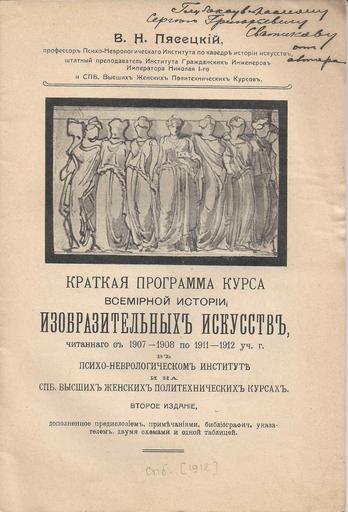 | Keywords: Pyasetsky Title Autograph.jpg en The title page of the book К аткая п ог амма ку са всеми ной исто ии изоб азительных искусств by V N Pyasetsky with the dedicatory inscription to Sergei Svatikov 1880 1942 the historian and political figure ru Титульный лист б ошю ы К аткая п ог амма ку са всеми ной исто ии изоб азительных искусств с да ственной надписью В Пясецкого Се гею Г иго ьевичу Сватикову 1880 1942 оссийскому исто ику и общественному деятелю The family archive Vladimir Nikolayevich Pyasetsky 1868-1934 1912 Pyasetsky Vladimir Nikolayevich PD-old |