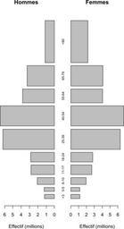 | Keywords: Pyramide ages france 2009 GNU R.svg fr Population française en 2009 par classe d'âge Fait avec GNU R modifié avec Inkscape en French male population in 2009 by age categories Made with GNU R modified with Inkscape 2013-02-08 own from http //www recensement-2009 insee fr/ INSEE ” Résultats du recensement de la population en 2009 table POP1A - Population par sexe et âge regroupé - Niveau agrégé Cdang cdang Data wikitable + Population française en 2009 - scope col Âge<br /> ans scope col Intervalle<br /> ans scope col Hommes<br /> millions scope col Femmes<br /> millions - <3 3 formatnum 1 214 562 formatnum 1 160 803 - 3-5 3 formatnum 1 220 968 formatnum 1 167 131 - 6-10 5 formatnum 2 053 854 formatnum 1 954 518 - 11-17 7 formatnum 2 814 253 formatnum 2 686 048 - 18-24 7 formatnum 2 858 320 formatnum 2 801 190 - 25-39 15 formatnum 6 191 481 formatnum 6 312 262 - 40-54 15 formatnum 6 518 532 formatnum 6 765 661 - 55-64 10 formatnum 3 837 422 formatnum 4 051 137 - 65-79 15 formatnum 3 303 222 formatnum 4 086 834 - >80 31 formatnum 1 112 268 formatnum 2 194 032 GNU R source code <source lang text > > data entry 'etiquettes' 'interv_age' 'hommes' 'femmes' recopier les données du tableau > popmax max hommes femmes > fenetres rbind c 0 0 57 0 1 c 0 45 1 0 1 > split screen figs fenetres 1 1 2 > screen 1 > barplot hommes interv_ages axisnames FALSE horiz TRUE + xlim c popmax 0 xlab Effectif millions > title Hommes > screen 2 > barplot femmes interv_ages horiz TRUE names arg etiquettes + xlim c 0 popmax xlab Effectif millions cex names 0 7 > title Femmes > close screen all TRUE </source> GNU R Population pyramids of France Cc-zero |