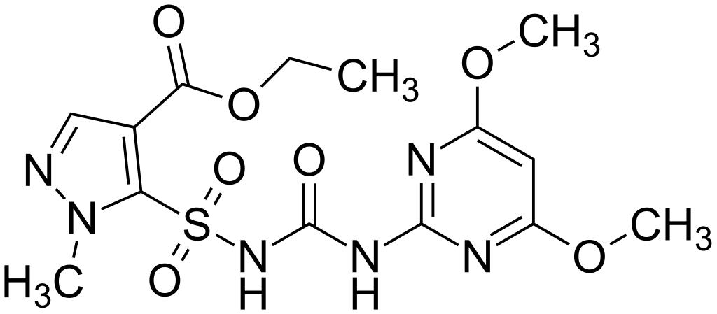 | Keywords: Pyrazosulfuron-ethyl 200.svg validSVG Structure of ethyl 5- N- 4 6-dimethoxypyrimidin-2-yl carbamoyl sulfamoyl -1-methyl-1H-pyrazole-4-carboxylate Own 2014-05-06 Emeldir <span class signature-talk >talk</span> Chemical structure verified https //upload wikimedia org/wikipedia/commons/1/1c/Pyrazosulfuron-ethyl_200 svg 1S/C14H18N6O7S/c1-5-27-12 21 8-7-15-20 2 11 8 28 23 24 19-14 22 18-13-16-9 25-3 6-10 17-13 26-4/h6-7H 5H2 1-4H3 H2 16 17 18 19 22 BGNQYGRXEXDAIQ-UHFFFAOYSA-N 93697-74-6 Synonyms <small><nowiki>5- 4 6-Dimethoxy-2-pyrimidinyl aminocarbonylaminosulfonyl-1-methyl-1H-pyrazole-4-carboxylic acid ethyl ester Acord R Agreen R ethyl 5- 4 6-dimethoxy-2-pyrimidinyl amino carbonyl amino sulfonyl -1-methyl-1H-pyrazole-4-carboxylate Ethyl 5- 4 6-dimethoxy-2-pyrimidinyl amino carbonyl amino sulfonyl -1-methyl-1H-pyrazole-4-carboxylate Ethyl 5- 4 6-dimethoxypyrimidin-2-ylcarbamoylsulfamoyl -1-methylpyrazole-4-carboxylate NC-311 pyrazosulfuron-ethyl Pyrazosulfuron-ethyl Sirius Sirius R </nowiki></small> PD-chem Sulfonylurea herbicides Herbicides Methyl ethers Pyrimidines Pyrazoles Ethyl esters Carboxylate esters |