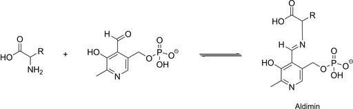 | Keywords: Pyridoxalphosphat aldimin.svg Information reaction of an amino acid with pyridoxal-phosphate to a Schiff-base aldimine Own 2007-05-24 User Alcibiades Check categories 2009 February 13 de wikipedia Pyridoxalphosphat 2 Coenzymes Organophosphates |