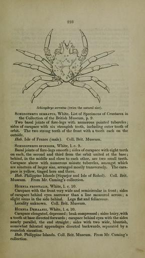 | Keywords: PZSL1847Page223.png Schizophrys aspera <small> H Milne-Edwards 1834 </small> en Adult of a spider crab from dorsal Proceedings of the Zoological Society of London http //archive org/details/lietuvostsrmoksl44liet vol 1847 http //archive org/stream/lietuvostsrmoksl44liet page/223/mode/1up page 223 1847 published 1848 Adam White text PD-old-70-1923 PZSL1840-1847 Schizophrys aspera |