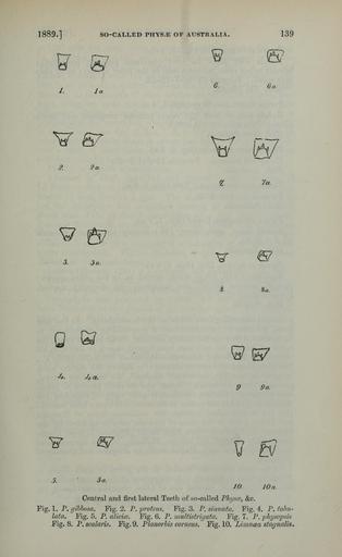 Keywords: PZSL1889Page139.png Physa gibbosa <small>Gld </small> Glyptophysa gibbosa <small> Gould 1846 </small> Physa proteus <small>Sow </small> Glyptophysa proteus <small> Sowerby 1873 </small> Physa sinuata <small>Gld </small> Physastra sinuata <small> Gould 1852 </small> / Physastra tongana <small> Quoy Gaimard 1832 </small> Physa tabulata <small>Gray</small> Physastra variabilis <small> Gray 1843 </small> Physa aliciæ <small>Thomas</small> Glyptophysa aliciae <small> Reeve 1862 </small> / Glyptophysa petiti <small> Crosse 1872 </small> Physa multistrigata <small>Tate</small> Glyptophysa multistrigata <small> Cooke 1889 </small> Physa physopsis <small>Cooke</small> Isidorella physopsis <small> Cooke 1887 </small> Physa scalaris <small>Dkr </small> Bulinus scalaris <small> Dunker 1845 </small> Planorbis corneus Planorbarius corneus <small> Linnaeus 1758 </small> Limnæa stagnalis sic Lymnaea stagnalis <small> Linnaeus 1758 </small> en Central left and first lateral a right radula teeth of ramshorn snails 1-9 including Great Ramshorn 9 and Great Pond Snail 10 Proceedings of the Zoological Society of London http //archive org/details/proceedingsofgen89zool vol 1889 issue 1 http //archive org/stream/proceedingsofgen89zool page/139/mode/1up page 139 1889 A H Cooke text PD-old PZSL 1889-2 Panpulmonata Gastropoda radula Planorbidae Bulinus Planorbarius corneus Lymnaea stagnalis |
