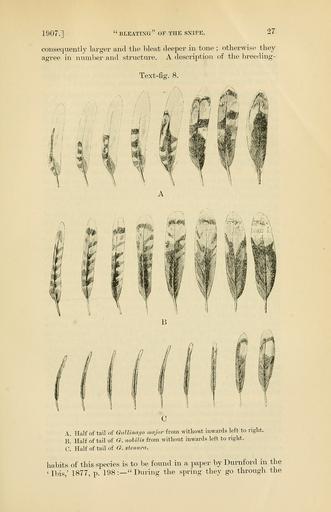 Keywords: PZSL1907Page027.png A Gallinago major Gallinago media <small> Latham 1787 </small><br/> B Gallinago nobilis Gallinago nobilis <small>P L Sclater 1856</small><br/> C Gallinago stenura Gallinago stenura <small> Bonaparte 1830 </small><br/> en Rectrices of right tail half arranged from outermost left to central right Top to bottom Great Snipe Noble Snipe Pin-tailed Snipe Proceedings of the Zoological Society of London http //archive org/details/proceedingsofzoo19071446zool vol 1907 issue 1 http //archive org/stream/proceedingsofzoo19071446zool page/27/mode/1up page 27 1907 P H Bahr text PD-old PZSL 1907-1 Snipes in art Gallinago media illustrations Gallinago stenura Rectrices Scolopacidae feathers |