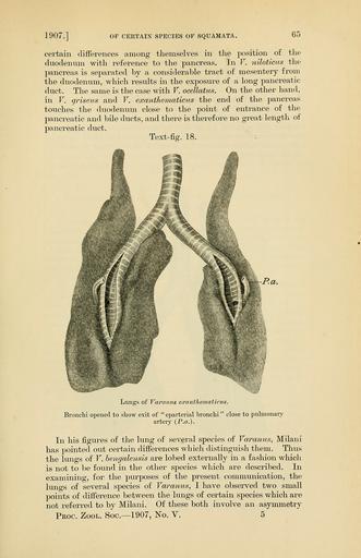 | Keywords: PZSL1907Page065.png Varanus exanthematicus Varanus exanthematicus <small> Bosc 1792 </small> en Lungs trachea and bronchs of a Savannah Monitor from dorsal bronchs cut open to show opening of eparterial bronchus right P a pulmonary artery Proceedings of the Zoological Society of London http //archive org/details/proceedingsofzoo19071446zool vol 1907 issue 1 http //archive org/stream/proceedingsofzoo19071446zool page/65/mode/1up page 65 1907 F E Beddard text PD-old PZSL 1907-1 Varanus exanthematicus Animal lungs Animal trachea Varanus anatomy |