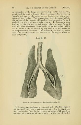 | Keywords: PZSL1907Page066.png Varanus griseus Varanus griseus <small> Daudin 1803 </small> en Lungs trachea and bronchs of a Desert Monitor from dorsal bronchs cut open to show opening of eparterial bronchus right P a pulmonary artery Proceedings of the Zoological Society of London http //archive org/details/proceedingsofzoo19071446zool vol 1907 issue 1 http //archive org/stream/proceedingsofzoo19071446zool page/66/mode/1up page 66 1907 F E Beddard text PD-old PZSL 1907-1 Varanus griseus Animal lungs Animal trachea Varanus anatomy |