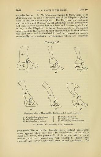 | Keywords: PZSL1907Page1054.png A Procolophon trigoniceps Procolophon trigoniceps <small>Owen 1876</small><br/> B Galechirus scholtzi Galechirus scholtzi <small>Broom 1907</small><br/> C Ictidosuchus primævus Ictidosuchus primaevus <small>Broom 1900</small><br/> D Oudenodon baini sic Oudenodon bainii <small>Owen 1860</small><br/> E Galesuchus browni sic Aelurosuchus browni <small>Broom 1906</small><br/> F Ornithorhynchus anatinus <small></small> Ornithorhynchus anatinus <small> Shaw 1799 </small><br/> en Shoulder joint of the Platypus F compared to mammal-like reptiles Sc scapula Co coracoid P Co procoracoid Proceedings of the Zoological Society of London http //archive org/details/proceedingsofzoo19074471121zool vol 1907 issue 4 http //archive org/stream/proceedingsofzoo19074471121zool page/1054/mode/1up page 1054 1907 published 1908 R Broom text PD-old PZSL 1907-4 Shoulders Evolutionary zoology Reptiliomorpha Procolophon Anomodontia Ictidosuchidae Oudenodon Bauriidae Ornithorhynchus anatinus anatomy Scapula Animal bone comparisons |