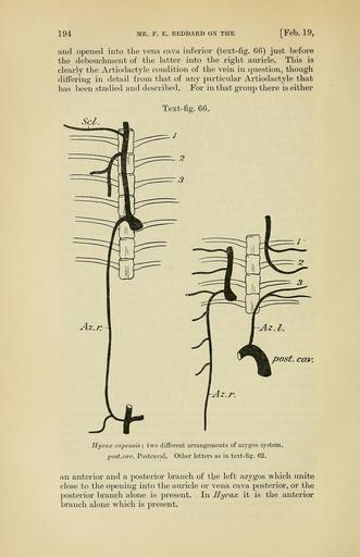 | Keywords: PZSL1907Page194.png Hyrax capensis Procavia capensis <small> Pallas 1766 </small> en Parietal veins of the Rock Hyrax from ventral typical layout right and right side of variant layout left found in one female possibly congenital aberration 1/2/3 first ribs Az l hemiazygos vein Az r azygos vein post cav inferior vena cava Scl subclavian vein Proceedings of the Zoological Society of London http //archive org/details/proceedingsofzoo19071446zool vol 1907 issue 1 http //archive org/stream/proceedingsofzoo19071446zool page/194/mode/1up page 194 1907 F E Beddard text PD-old PZSL 1907-1 Procavia capensis anatomy Mammal circulatory system Veins inferior vena cava |