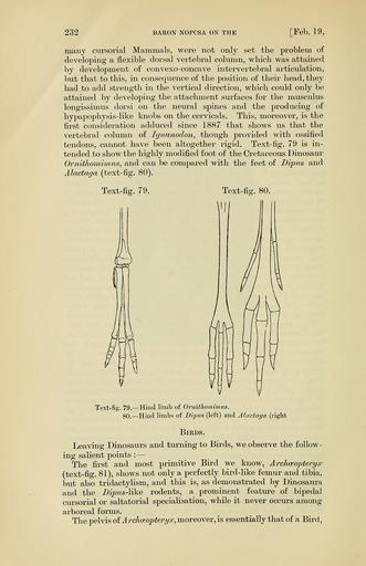 Keywords: PZSL1907Page232.png 79 left Ornithomimus sp Ornithomimidae sp <br/> 80 center Dipus sp Dipus sagitta <small> Pallas 1773 </small><br/> 80 right Alactaga sp Allactaga sp en Feet of a Cretaceous ostrich dinosaur left a Northern Three-toed Jerboa center and an undetermined species of Asian five-tailed jerboa right all in frontal view Proceedings of the Zoological Society of London http //archive org/details/proceedingsofzoo19071446zool vol 1907 issue 1 http //archive org/stream/proceedingsofzoo19071446zool page/232/mode/1up page 232 1907 Baron Nopcsa text PD-old PZSL 1907-1 Animal limb bone comparisons Animal feet Ornithomimus fossils Cretaceous fossils Reptilia limb bones Reptilia feet Dipus sagitta Allactaga Mammal limb bones Dipodidae bones Rodentia feet Ferenc Nopcsa |