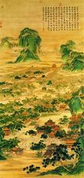| Keywords: Qing Court Artists - The New City of Feng.jpg National Palace Museum Taibei <br> The founder of the Han Dynasty Liu Bang originally came from the city of Feng In order to please his father he modified part of the new Han capital at Chang An to resemble the original city of Feng County going so far as to import residents from that city to populate the new city This painting commemorates that city The inscription is poetry from the Qianlong Emperor Scan from New Visions at the Ch'ing Court Tang Dai 唐岱 1673-after 1752 Sun Hu 孫 Shen Yuan 沈源 ca 1736-1795 Zhou Kun 孫 Ding Guanpeng 丁 鵬 active 1708-1771 Qing Dynasty 1644-1911 PD-Art PD-old-100 Ding Guanpeng Paintings of the Qing Dynasty Shan shui paintings in the National Palace Museum Tang Dai |