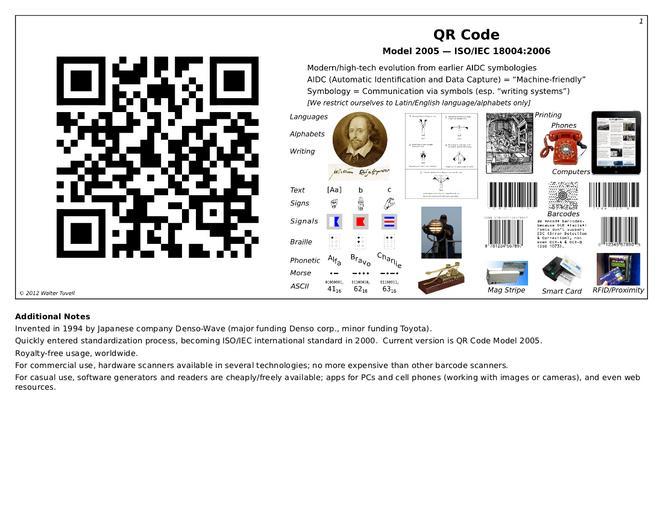 | Keywords: QRCode-1-Intro.png en wikipedia 2012 February 23 en Created by me using Inkscape GIMP LibreOffice Sources of the included images accessed Jan 5 2012 Morse code flag signals International Code of Signals U S edition National Imagery and Mapping Agency Pub 102 1969 revised 2003 Seaman transmitting Morse code http //en wikipedia org/wiki/File Seaman_send_Morse_code_signals jpg Telegraph key http //www magnet fsu edu/education/tutorials/museum/morsetelegraph html Printing press http //en wikipedia org/wiki/File Printer_in_1568-ce png iPad with New York Times http //www digitaltrends com/computing/new-york-times-offering-discounted-digital-subscriptions-as-part-of-todays-paywall-launch/ Mag stripe http //www diytrade com/china/4/products/1241277/Portable_Magnetic_Stripe_Data_Collector html normal_img Smart card http //www tootoo com/s-ps/iso-card-smart-card-contact-ic-card--p-1627164 html Prox/RFID card http //www indexoftheweb com/Patriot/RFID_Mark_Of_The_Beast htm Hand signs http //student ucr edu/~cande009/language html Signal flags http //en wikipedia org/wiki/Maritime_signal_flags Shakespeare http //biography4u com/shakespeare html Phone http //www eurocosm com/application/products/teleph/american-500-series-telephones-GB asp Maxicode sample http //www barcode-2d com/ I generated the main sample QR code myself using qrencode I generated the other barcode samples myself using Scribus 2012-1-5 Own <br />Transferred from http //en wikipedia org en wikipedia Wtuvell at http //en wikipedia org en wikipedia diagram en wikipedia Wtuvell Original upload log page en wikipedia QRCode-1-Intro png 2012-01-05 21 32 Wtuvell 1100×850 255734 bytes <nowiki>Created by me using Inkscape GIMP LibreOffice Sources of the included images accessed Jan 5 2012 Morse code flag signals International Code of Signals U S edition National Imagery and Mapping Agency Pub 102 1969 revised 200</nowiki> QR Code Diagrams |
