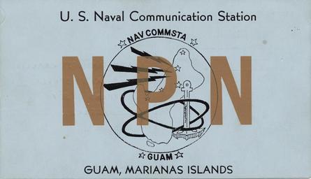 Keywords: QSL-Navy-NPN-1980.jpg en QSL card sent by NPN US NAVCOMSTA Guam in 1980 in acknowledgement of reception of transmissions on 13380 kHz Own collection US Navy 1980 PD-USGov-Military-Navy QSL cards