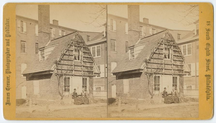 Keywords: stereographs streets walnut street walnutstreet philadelphia philadelphia monthly meeting of the religious society of friends philadelphiamonthlymeetingofthereligioussocietyoffriends almshouses charity benevolence james cremer jamescremer Shows the Quaker Almshouse cottage,Walnut Street, Philadelphia, ca. 1876. Two women sit on a bench in front of the cottage. Erected along with six other homes in 1713 as free housing for the poor of the Philadelphia Monthly Meeting of the Religious Society of Friends, the cottage is demolished in 1876. Accession number: P.2011.47.1966 Shows the Quaker Almshouse cottage,Walnut Street, Philadelphia, ca. 1876. Two women sit on a bench in front of the cottage. Erected along with six other homes in 1713 as free housing for the poor of the Philadelphia Monthly Meeting of the Religious Society of Friends, the cottage is demolished in 1876. Accession number: P.2011.47.1966 |