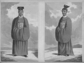| Keywords: Quan phuc nha Nguyen.gif Mandarins in Nguyen Dynasty about 1820 The left is Literature Mandarin the right is Military Mandarin described as The Mandarins wore a cap of a peculiar form and on a square piece of silk on the breast of their gown was embroi- dered the badge of their order That of the military chief was a boar and of the man of letters a stork Hình ảnh quan lại th i Nguyễn khoảng năm 1820 Phía trái là quan văn bên phải là quan võ nguyên văn trong sách Những ông quan này đội một cái mũ có hình thù kỳ dị Thêu trên một miếng vải vuông đính phía trước ngực áo là hình ảnh tước vị của họ Vị quan võ là một lợn còn ông quan văn là hình con cò http //dlxs library cornell edu/cgi/t/text/pageviewer-idx c sea cc sea idno sea010 q1 saigon node sea010 3A9 frm frameset view image seq 550 Journal of an Embassy to the Courts of Siam and Cochin-China exhibiting a view of the actual State of these Kingdoms John Crawfurd 1783-1868 London 1828 from Cornell Library 1828 Unknown there is a line below the picture in the book that says Drawn by a Chinese Public domain PD-old Nguyễn dynasty Mandarin square Mandarin bureaucrat John Crawfurd |