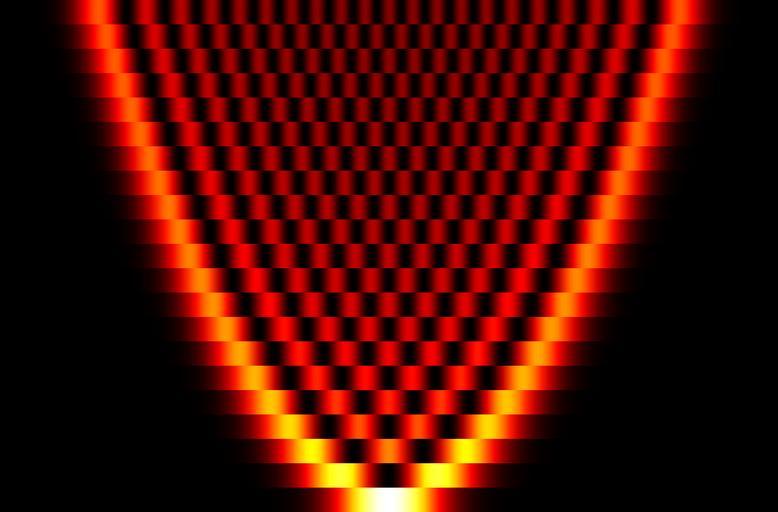 Keywords: Quantum Harmonic Oscillator Levels.png quantum harmonic oscillator for energy levels n 0 to 20 The probability density is shown by the colour black is the lowest white is the highest own Inductiveload 2009-04-19 Mathematica Code <pre><nowiki> QHO wavefunction psin_ x_ Exp-x 2/2 / Sqrt2 n n SqrtPi HermiteHn x; Colour function colourFuncx_ Blend Black Red Yellow White x 1 8 ; Generates a single strip showing one QHO energy level wavefunction leveln_ DensityPlot psin x 2 x -8 8 y 0 1 PlotRange -> 0 0 7 PlotPoints -> 100 2 Frame -> False ColorFunction -> colourFunc AspectRatio -> 1/32 ImageSize -> 1600 Method -> ShrinkWrap -> True Remove whitespace at edges ColorFunctionScaling -> False Have a consistent CF scaling ; Assemble the entire drawing of all levels graphic GraphicsGrid ReverseTable levelk k 0 20 Spacings -> 0 </nowiki></pre> 1D quantum harmonic oscillators |