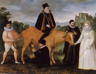 | Keywords: Queen Elizabeth I Feeds the Dutch Cow.png King Philip II of Spain is vainly trying to ride the cow drawing blood with his spurs Queen Elizabeth is feeding it while William of Orange holds it steady by the horns The cow is defecating on the Duke of Anjou who is holding its tail <br/> <br/>The picture was painted in the period following the visit of François Duke of Anjou brother of King Henry III of France to Queen Elizabeth's court in 1581 “82 to discuss his marriage proposal and his military support for the Anglo-Dutch alliance against the Spanish Anjou's subsequent mission to the Netherlands met with disaster when his army was massacred by the citizens of Antwerp in early 1583 William of Orange was assassinated the following year The dating of the picture to about 1586 is based on its use of an image of Philip by William Key engraved in that year Reference Hearn p 87 Karen Hearn Dynasties London Tate 1995 ISBN 1854371576 p 87 Anonymous; Flemish school Uploaded by qp10qp c 1586 left 100px PD-Art Elizabeth I of England Portrait paintings of Philip II of Spain William the Silent François Duke of Anjou Satire Milking in art Male fur clothing in art Satirical art works Eighty Years' War 1582 Fur fashion in 1586 |