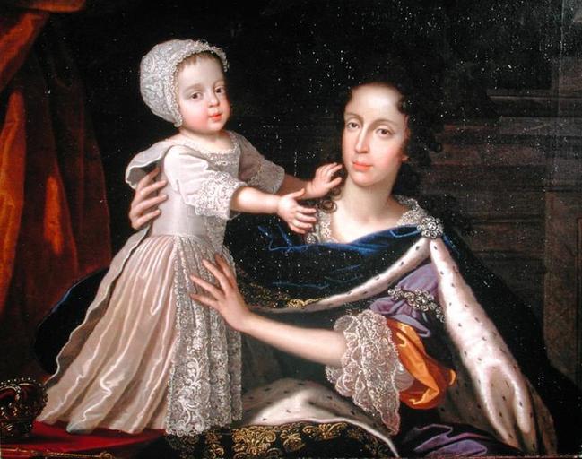 | Keywords: people gown costume Mary of Modena (Mary Beatrice Eleanor Anne Margaret Isabel; born Este; later Queen Mary of England, Scotland and Ireland; 5 October 1658 – 7 May 1718) was queen consort to James II of England. Her reign as consort lasted from 6 February 1685 until 11 December 1688. Mary was crowned Queen consort on 23 April 1685. Mary was born on 5 October 1658 at the Ducal Palace in Modena, Italy, the eldest child and only daughter of Alfonso IV, Duke of Modena and his wife, the former Laura Martinozzi. She had one younger brother Francesco II d'Este, who became Duke of Modena and Reggio at the age of two, upon the death of their father who died when Mary was four years old. Their mother Laura acted as Francesco's regent until 1674 when he assumed full control. Her paternal grandparents were Francesco I d'Este and Maria Caterina Farnese of Parma. Her maternal grandparents were Girolamo Martinozzi and Laura Mazzarini. Two of Mary's maternal cousins were Hortense Mancini, a mistress of her brother-in-law, King Charles II; and the notorious intrigante Olympia Mancini, Countess of Soissons, who was implicated in the Poison Affair which resulted in her expulsion from France. Mary was a descendant of King Henry II of France and Catherine de Medici. Mary was married to James, Duke of York, by proxy in a Catholic ceremony on 20 September 1673; they were married in person on 21 November 1673 with Nathaniel Crew, Bishop of Oxford officiating at the Anglican ceremony. Mary's mother Laura had accompanied her daughter to England. The marriage had urgent dynastic and political aspects. James had two Protestant daughters, Mary and Anne, from his first marriage to Anne Hyde. A son by James's second marriage would be king one day, a Roman Catholic king. Though Mary was beautiful and charming — Charles II quickly came round to her — the people of England disliked her for her Roman Catholicism. She was lampooned in broadsheets under the name "Madame East". Rumours spread that she was an agent of the pope, Clement X, who had pressed her case as a suitable bride. During the "Popish Plot" (1678), in which her secretary, Coleman, was involved, she and James discreetly went abroad. Their first male child was stillborn (1674), and numerous others died in infancy or early childhood. Following James's accession to the throne in 1685, the question of whether Mary would ever bear a son became more significant, because such a child would be brought up in the Roman Catholic faith and would be heir to the throne. In 1688, Mary finally gave birth to a living son, James, nine months after bathing in the The Cross Bath at Bath.[1] The event caused much speculation. It was suggested that the child had been born dead and a changeling smuggled into the room in a warming pan in order to conceal the death, or that the Queen had never actually been with child. Broadsheets depicting the queen stuffing pillows into her gown or cuckolding her husband with her confessor were common. For political reasons, a royal birth was a very public event, and many people would have had to be privy to this unlikely conspiracy. Nevertheless the rumours were disquieting enough that James called two extraordinary sessions of his Privy Council to hear testimony proving that the young Prince of Wales was his son by the Queen, though James's daughters disputed the child's legitimacy. Within a few months of the heir's birth, the Glorious Revolution erupted. Mary consented to escape to France (10 December 1688) with her son. James's elder daughter, Mary, with her husband, William III of Orange, had been invited by the Whigs to take the throne. In exile, as guests and dependents of Louis XIV at the Chateau of Saint-Germain-en-Laye, Mary gave birth to one more child, Princess Louisa Maria, who died of smallpox at the age of nineteen. When James died on 6 September 1701, Mary succeeded in inducing Louis to recognize her son as king of England and Scotland, an act that accelerated English participation in the War of the Spanish Succession. She supported Jacobite exiles to the best of her ability. Queen Mary died in Château de Saint-Germain-en-Laye near Paris of breast cancer. Her tomb, in the abbey of Chaillot, was destroyed during the French Revolution. Mary of Modena (Mary Beatrice Eleanor Anne Margaret Isabel; born Este; later Queen Mary of England, Scotland and Ireland; 5 October 1658 – 7 May 1718) was queen consort to James II of England. Her reign as consort lasted from 6 February 1685 until 11 December 1688. Mary was crowned Queen consort on 23 April 1685. Mary was born on 5 October 1658 at the Ducal Palace in Modena, Italy, the eldest child and only daughter of Alfonso IV, Duke of Modena and his wife, the former Laura Martinozzi. She had one younger brother Francesco II d'Este, who became Duke of Modena and Reggio at the age of two, upon the death of their father who died when Mary was four years old. Their mother Laura acted as Francesco's regent until 1674 when he assumed full control. Her paternal grandparents were Francesco I d'Este and Maria Caterina Farnese of Parma. Her maternal grandparents were Girolamo Martinozzi and Laura Mazzarini. Two of Mary's maternal cousins were Hortense Mancini, a mistress of her brother-in-law, King Charles II; and the notorious intrigante Olympia Mancini, Countess of Soissons, who was implicated in the Poison Affair which resulted in her expulsion from France. Mary was a descendant of King Henry II of France and Catherine de Medici. Mary was married to James, Duke of York, by proxy in a Catholic ceremony on 20 September 1673; they were married in person on 21 November 1673 with Nathaniel Crew, Bishop of Oxford officiating at the Anglican ceremony. Mary's mother Laura had accompanied her daughter to England. The marriage had urgent dynastic and political aspects. James had two Protestant daughters, Mary and Anne, from his first marriage to Anne Hyde. A son by James's second marriage would