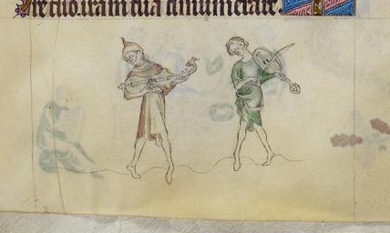| Keywords: Queen Mary Psalter two men dancing playing citole and rebec.jpg en British Museum image Royal 2 B VII f 203 Detail of a bas-de-page scene of two men dancing one playing a citole and the other a rebec 1320-01-01 http //www bl uk/catalogues/illuminatedmanuscripts/record asp MSID 6467 CollID 16 NStart 20207 the Queen Mary Master other versions http //www bl uk/catalogues/illuminatedmanuscripts/ILLUMIN ASP Size mid IllID 53167 From Queen Mary psalter Wikipedia article The psalter was perhaps produced c 1310 “1320 by one main scribe and unusually for a work so heavily illuminated a single artist 4 who is now known as the Queen Mary Master It was probably made in London and possibly for Isabella of France queen of Edward II of England 5 though there is no agreement on the matter 4 For the next two hundred years its history is not known A note in a sixteenth-century hand indicates that it was owned by an Earl of Rutland and though it does not identify the earl it appears likely that it was Henry Manners A Protestant he was imprisoned in May 1553 which may explain how the psalter landed in the possession of Queen Mary a second note in Latin explains that the psalter was impounded by Baldwin Smith a customs officer and thus remained in England 6 It remained in the possession of Queen Mary and her successors until 1757 when George II donated the Old Royal Library to the British Museum 3 PD-old-70-1923 Queen Mary Psalter 1310-1320 - BL Royal MS 2 B VII Citole Rebec Medieval miniatures of musicians String instruments in art String instruments Lute family instruments Guitar family instruments |