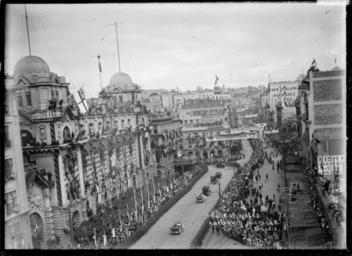 | Keywords: blackandwhite monochrome photo border skyline outdoor architecture city black and white View taken from a high vantage point looking up Queen Street, Auckland, during the arrival of the Prince of Wales, April 1920. The Post Office and surrounding buildings are decorated with flags and foliage. A motorcade of cars are driving up Queen Street and turning left into Custom Street; people are lining the streets watching the procession. Photograph taken by William Archer Price. Inscriptions: Inscribed - Photographer's title on negative -bottom right: Prince of Wales. Arrival in Auckland. No 4481A. Quantity: 1 b&w original negative(s). Physical Description: Dry plate glass negative 4.75 x 6.5 inches Queen Street, Auckland, during arrival of the Prince of Wales. Price, William Archer, 1866-1948 :Collection of post card negatives. Ref: 1/2-000435-G. Alexander Turnbull Library, Wellington, New Zealand. natlib.govt.nz/records/23252114 View taken from a high vantage point looking up Queen Street, Auckland, during the arrival of the Prince of Wales, April 1920. The Post Office and surrounding buildings are decorated with flags and foliage. A motorcade of cars are driving up Queen Street and turning left into Custom Street; people are lining the streets watching the procession. Photograph taken by William Archer Price. Inscriptions: Inscribed - Photographer's title on negative -bottom right: Prince of Wales. Arrival in Auckland. No 4481A. Quantity: 1 b&w original negative(s). Physical Description: Dry plate glass negative 4.75 x 6.5 inches Queen Street, Auckland, during arrival of the Prince of Wales. Price, William Archer, 1866-1948 :Collection of post card negatives. Ref: 1/2-000435-G. Alexander Turnbull Library, Wellington, New Zealand. natlib.govt.nz/records/23252114 |