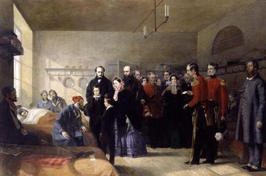 | Keywords: Queen Victoria's First Visit to her Wounded Soldiers by Jerry Barrett.jpg Queen Victoria's First Visit to her Wounded Soldiers by Jerry Barrett died 1906 See source website for additional information Queen Victoria's First Visit to Her Wounded Soldiers Victoria is accompanied by her husband Prince Albert and her sons the Prince of Wales and Prince Alfred Accompanying the royal family are George Barratt Charlotte Canning Countess Canning George Russell Dartnell Col and Mrs Eden Prince George Duke of Cambridge Sir Charles Grey Henry Hardinge 1st Viscount Hardinge Hon Lucy May Kerr and Sir Charles Beaumont Phipps The man seated on the bed is identified as Sergeant Leny while the wounded soldier in the bed is identified as James Higgins The men are attended by army surgeon Henry Cooper Reade This set of images was gathered by User Dcoetzee from the National Portrait Gallery London website using a special tool All images in this batch have been confirmed as author died before 1939 according to the official death date listed by the NPG 6203 http //www npg org uk/collections/search/portrait php LinkID mp01915 rNo 0 role sit 1859 Jerry Barrett died 1906 PD-old-100 National Portrait Gallery London Paintings of Victoria of the United Kingdom Jerry Barrett Charlotte Canning Wounded people in art Children in art 19th-century medicine in painting 19th-century military life in painting Soldiers life during the Crimean War |