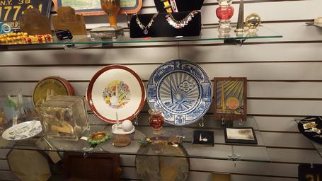 Keywords: worldsfairmemorabilia souvenirs dishes Close up of dishes, pins, ashtrays, jewelry of the previous picture. Close up of dishes, pins, ashtrays, jewelry of the previous picture.