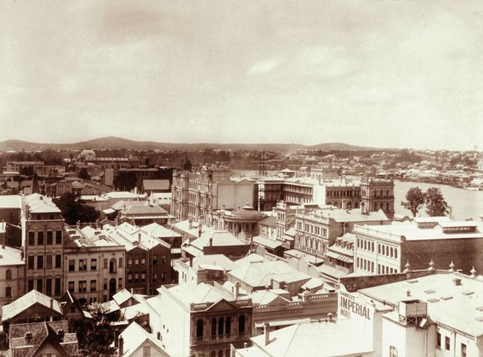 | Keywords: Queensland State Archives 2291 View of Brisbane from chimney of Bartons Electric Works and vicinity of Adelaide Street towards Treasury Building c 1897.png en View of Brisbane from chimney of Bartons Electric Works and vicinity of Adelaide Street towards Treasury Building This photograph makes a panorama with Digital Image ID 2292 1897 http //www archivessearch qld gov au/Image/DigitalImageDetails aspx ImageId 2291 Preferred citation Queensland State Archives Digital Image ID 2291 ID label 1108481 http //www archivessearch qld gov au/Search/AgencyDetails aspx AgencyID 1993 Lands Department Survey of Lands Branch Photographic Branch en Copyright expired Information field Decade 1890-1899 Information field Place en Brisbane City Information field Keywords en Historic buildings Information field Material Type en Photographic material Information field Type en Image PD-Australia QSA media uploaded by User 99of9 Photographic material from the Queensland State Archives Queensland in the 1890s Brisbane CBD Landscapes of Queensland Treasury Building Brisbane Adelaide Street Brisbane Panoramics in Queensland |