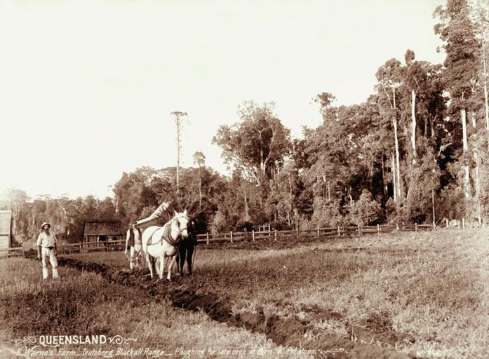| Keywords: Queensland State Archives 5100 Ploughing for late crop of corn at F Warnes Homestead Teutoberg Blackall Range c 1899.png en Ploughing for late crop of corn at F Warne's Homestead Teutoberg Blackall Range 1899 http //www archivessearch qld gov au/Image/DigitalImageDetails aspx ImageId 5100 Preferred citation Queensland State Archives Digital Image ID 5100 ID label 1352647 http //www archivessearch qld gov au/Search/AgencyDetails aspx AgencyID 1993 Lands Department Survey of Lands Branch Photographic Branch en Copyright expired Information field Decade 1890-1899 Information field Place en Blackall-Tambo Region Information field Keywords en Horse teams Information field Material Type en Photographic material Information field Type en Image PD-Australia QSA media uploaded by User 99of9 Photographic material from the Queensland State Archives Queensland in the 1890s Homesteads in Queensland Blackall Range Witta Queensland Maize |