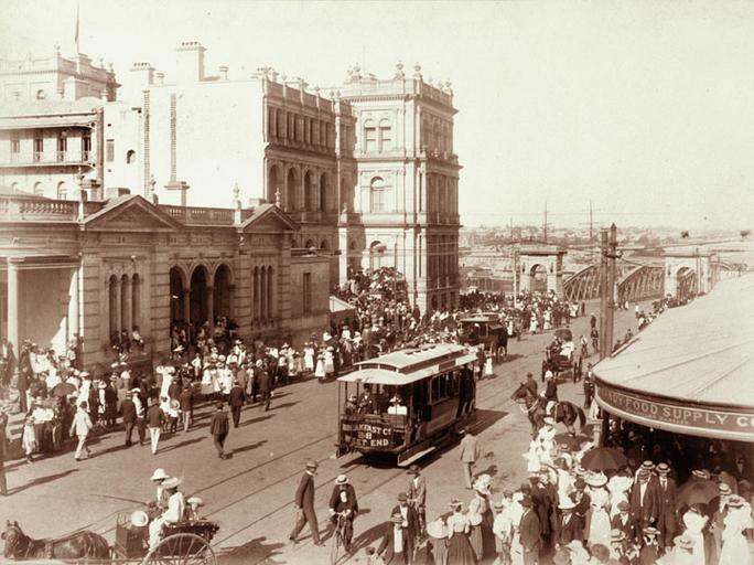 | Keywords: Queensland State Archives 5167 Tram and crowd scene in Queen Street near George Street Brisbane c 1899.png en Tram and crowd scene in Queen Street near George Street Brisbane 1899 http //www archivessearch qld gov au/Image/DigitalImageDetails aspx ImageId 5167 Preferred citation Queensland State Archives Digital Image ID 5167 ID label 1367621 http //www archivessearch qld gov au/Search/AgencyDetails aspx AgencyID 1993 Lands Department Survey of Lands Branch Photographic Branch en Copyright expired Information field Decade 1890-1899 Information field Place en Brisbane City Information field Keywords en Horse-drawn vehicles Information field Material Type en Photographic material Information field Type en Image PD-Australia QSA media uploaded by User 99of9 Photographic material from the Queensland State Archives 1899 in Brisbane Queen Street Brisbane George Street Brisbane Second Victoria Bridge Brisbane Trams in Brisbane Treasury Building Brisbane |
