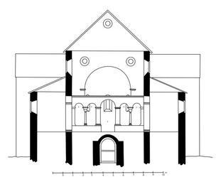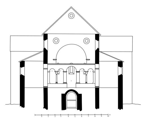 | Keywords: Querschnitt vor Chorschranke Rekonstruktion Müller.svg en Cross section of the Einhardsbasilika at Steinbach Germany Einhardsbasilika Steinbach bei Michelstadt Hessen<br/> Aus Bild Querschnitt_vor_Chorschranke_Rekonstruktion_Müller jpg Die Rekonstruktionszeichnung zeigt den Querschnitt durch die Basilika mit Blickrichtung Osten vor der Chorschranke Die Fragezeichen in der Chorschranke bedeuten daß die genaue Gestalt der Chorschranke unklar ist Zu erkennen ist in der Bildmitte die Hauptapsis mit einem Rundbogenfenster sowie die Querschnitte durch die Seitenwände des Hauptschiffs der Seitenschiffe und eines Teils der Krypta hier der Mittelgang Richtung Osten Weiterhin ist die abgestufte Dachkonstruktion und der Blick auf die Westseite der Nebenchöre erkennbar own work based on de Bild Querschnitt_vor_Chorschranke_Rekonstruktion_Müller jpg by de Benutzer Capaci34 based on the dissertation of Dr Otto Müller 1937 MaEr 2008-08-24 49 41 15 N 08 59 48 E Plans of Einhardsbasilika Steinbach Reconstruction drawings of medieval buildings in Germany |