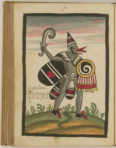 | Keywords: Quetzalcoatl, a Major Deity of the Cholula People WDL6756.png Artwork ru Това Хуан де около 1546 г около 1626 г fr Tovar Jean de 1546-1626 env en Tovar Juan de circa 1546-circa 1626 zh 胡安·德·托瓦尔,约 1546 年 - 约 1626 年 pt Tovar Juan de por volta de 1546-por volta de 1626 ar خوان دو توفار، حوالي 1546-حوالي 1626 es Tovar Juan de circa 1546-circa 1626 ru Кетцалькоатль главное божество на ода чолула fr Quetzalcoatl principal dieu du peuple de Cholula en Quetzalcoatl a Major Deity of the Cholula People zh 魁 尔科亚特尔,乔卢拉人的主要神灵 pt Quetzalcoatl uma grande divindade do povo cholula ar كيتسالكواتل، من أسمى آلهة شعب تشولولا ru Кодекс Това а авто ом кото ого считается мексиканский иезуит XVI века Хуан де Това соде жит под обную инфо мацию об об ядах и це емониях ацтеков известных также как мешика Кодекс п оиллюст и ован 51 аква ельным исунком на полную ст аницу Рисунки в кото ых наблюдается значительное влияние пиктог афических укописей доколониальных в емен обладают исключительными художественными достоинствами Рукопись состоит из т ех азделов В пе вом азделе описана исто ия путешествий ацтеков до п ибытия испанцев Вто ой аздел п едставляющий собой иллюст и ованную исто ию ацтеков составляет основной объем укописи В т етьем азделе находится календа ь Това а а этой иллюст ации из вто ого аздела изоб ажен Кетцалькоатль в конусооб азной шляпе и накидке с клювом щитом ук ашенным пе ьями и изогнутым ножом в уках Кетцалькоатль Пе натый змей один из главных богов ацтеков считался богом тво ения связанным с плодо одием и воск ешением а также с дождем в ипостаси Эхекатля бога вет ов В его честь в Чолуле был пост оен большой х ам С ним часто отождествляли Топильцина легенда ного и ве оятно действительно существовавшего ж еца п авившего Тулой в эпоху тольтеков; в описаниях он п едставал как светлокожий бо одатый мужчина Когда в 1519 г Э нан Ко тес п ибыл в ексику импе ато октесума II годы п авления 1502 1520 гг пове ил что Ко тес являлся воплощением Кетцалькоатля акидка шляпа и набед енная повязка напоминают к ылья бабочки символ павших воинов <br>Боги ацтеков; Ацтеки; Кодекс; Индейцы ексики; Ко енные на одности; езоаме ика; Кодекс Това а fr Le codex Tovar attribué à Jean de Tovar jésuite mexicain du XVI<sup>e</sup> siècle contient des informations détaillées sur les rites et les cérémonies des Aztèques également connus sous le nom de Mexicas Il est illustré de 51 aquarelles de la taille d'une page Fortement influencées par les manuscrits pictographiques de la période précontact ces peintures sont d'une qualité artistique exceptionnelle Le manuscrit est divisé en trois sections La première section contient une histoire des voyages des Aztèques avant l'arrivée des Espagnols La seconde section une histoire illustrée du peuple aztèque constitue la majeure partie du manuscrit La troisième section est constituée du calendrier de Tovar Cette illustration extraite de la seconde section représente Quetzalcoatl avec un chapeau conique un bec un bouclier orné de plumes et une cape tenant un couteau incurvé Quetzalcoatl Serpent à plumes l'une des principales divinités aztèques était un dieu de la création associé à la fertilité et à la résurrection mais également à la pluie sous la forme d'Ehecatl ou dieu du vent Cholula un grand temple lui était dédié Souvent assimilé à Topiltzin roi-prêtre légendaire et peut-être historique de Tula durant la période toltèque il était décrit comme ayant le teint clair et portant une barbe Lorsqu'Hernán Cortés arriva au Mexique en 1519 l'empereur Moctezuma II règne 1502 1520 crut qu'il s'agissait de Quetzalcoatl Le motif de la cape du chapeau et du pagne de ce dieu représente les ailes d'un papillon symbole des soldats tombés au combat <br>Dieux aztèques; Aztèques; Codex; Indiens du Mexique; Peuples autochtones; Méso-Amérique; Codex Tovar en The Tovar Codex attributed to the 16th-century Mexican Jesuit Juan de Tovar contains detailed information about the rites and ceremonies of the Aztecs also known as Mexica The codex is illustrated with 51 full-page paintings in watercolor Strongly influenced by pre-contact pictographic manuscripts the paintings are of exceptional artistic quality The manuscript is divided into three sections The first section is a history of the travels of the Aztecs prior to the arrival of the Spanish The second section an illustrated history of the Aztecs forms the main body of the manuscript The third section contains the Tovar calendar This illustration from the second section depicts Quetzalcoatl with conical hat a beak an
