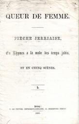 | Keywords: Queur de femme 1861.jpg Queur de femme Pièche Jerriaise En Rhymes a la mode des temps jadis et en chinq scènes Tchoeu dé femme pièche dé thiâtre en Jèrriais par Henri Luce Manuel 1818 - 1875 Cover of 1861 verse play in Jèrriais by Henry Luce Manuel own scan of copy of old document 1 d'Févri 2010 Man vyi Own work all rights released Public domain PD-old Jèrriais literature 1861 in theatre Theatre of Jersey Poetry of Jersey Jersey in the 19th century | ||||