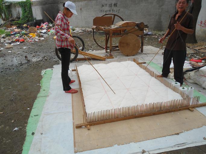Keywords: Quilt making 12.JPG en Blanket making in Haikou Hainan People's Republic of China Quilt makers cover the cotton batting with a lattice of thread The thread is fed through two holes at and near the tip of a long bamboo stick The stick is then used to loop the thread around the vertical pegs 2012-01-19 own Anna Frodesiak cc-zero Uploaded with UploadWizard Quilting in Haikou Files by User Anna Frodesiak Outdoor workers in China People at work in China |