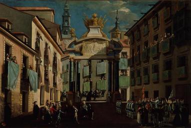Keywords: Quiros-arco carretas.JPG El lienzo representa el arco de triunfo que se alzó en la calle de Carretas de Madrid con motivo de la entrada en dicha ciudad del rey Carlos III que sucedió como rey de España a su hermanastro Fernando VI Hacia 1763 oil canvas Size cm 167 112 Institution Real Academia de Bellas Artes de San Fernando http //ceres mcu es/pages/Main object history exhibition history credit line accession number 0845 http //ceres mcu es/pages/Main PD-old-100 Paintings of Charles III of Spain Paintings by Lorenzo Quirós in the Royal Academy of Fine Arts of San Fernando 18th-century paintings in the Royal Academy of Fine Arts of San Fernando Historical images of Madrid 1760 Cities in the 18th century Spain in the 1760s Streets in art