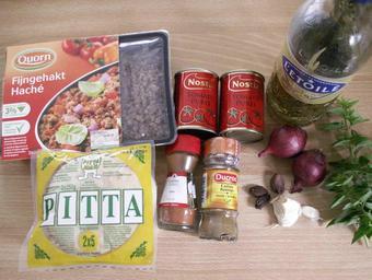 Keywords: Quornpitta requirements.jpg en The required materials for a VDP QE quornpitta own KVDP 2008-06-04 Quorn food brand Minced meat Onions