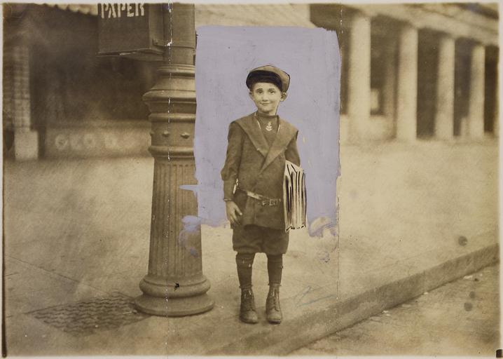 | Keywords: nara:arcid=306629 u.s. national archives usnationalarchives lewis hine lewishine people Original Caption: Photograph of a 7 year old news-boy (William Parralla, 313 2nd Street, S.W.), without a badge, who tried to "short change" the photographer when he sold him a paper. "He can rustle de poipers" another boy said, April 1912 U.S. National Archives’ Local Identifier: Photographer: Hine, Lewis Subjects: Child Labor National Child Labor Committee Working Conditions Factory Persistent URL: research.archives.gov/description/306629 Repository: Still Picture Records Section, Special Media Archives Services Division (NWCS-S), National Archives at College Park, 8601 Adelphi Road, College Park, MD, 20740-6001. For information about ordering reproductions of photographs held by the Still Picture Unit, visit: www.archives.gov/research/order/still-pictures.html Reproductions may be ordered via an independent vendor. NARA maintains a list of vendors at www.archives.gov/research/order/vendors-photos-maps-dc.html Access Restrictions: Unrestricted Use Restrictions: Unrestricted Original Caption: Photograph of a 7 year old news-boy (William Parralla, 313 2nd Street, S.W.), without a badge, who tried to "short change" the photographer when he sold him a paper. "He can rustle de poipers" another boy said, April 1912 U.S. National Archives’ Local Identifier: Photographer: Hine, Lewis Subjects: Child Labor National Child Labor Committee Working Conditions Factory Persistent URL: research.archives.gov/description/306629 Repository: Still Picture Records Section, Special Media Archives Services Division (NWCS-S), National Archives at College Park, 8601 Adelphi Road, College Park, MD, 20740-6001. For information about ordering reproductions of photographs held by the Still Picture Unit, visit: www.archives.gov/research/order/still-pictures.html Reproductions may be ordered via an independent vendor. NARA maintains a list of vendors at www.archives.gov/research/order/vendors-photos-maps-dc.html Access Restrictions: Unrestricted Use Restrictions: Unrestricted |