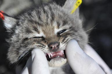 | Keywords: bobcat kitten carnivore animals animalsandinsects wildlife Springtime is baby time! Last week our wildlife team ear-tagged another litter of bobcat kittens. The kittens are B328, B329, and B330 because they are the 328th, 329th, and 330th bobcats we've tracked during our study. We've been tracking their mom, B295, since January 2012 and this is the first litter we're aware of since then. These are known as the kittens' "milk teeth" because they're essentially baby teeth. Bobcats are strict carnivores, but not much is known about when exactly they switch from nursing to eating meat. These kittens are about four weeks old, so they're definitely nursing at this age. Similar species have been documented to start eating meat starting around three months of age. Tooth eruption (first of baby teeth and then of adult teeth) is one of the ways biologists measure age. Springtime is baby time! Last week our wildlife team ear-tagged another litter of bobcat kittens. The kittens are B328, B329, and B330 because they are the 328th, 329th, and 330th bobcats we've tracked during our study. We've been tracking their mom, B295, since January 2012 and this is the first litter we're aware of since then. These are known as the kittens' "milk teeth" because they're essentially baby teeth. Bobcats are strict carnivores, but not much is known about when exactly they switch from nursing to eating meat. These kittens are about four weeks old, so they're definitely nursing at this age. Similar species have been documented to start eating meat starting around three months of age. Tooth eruption (first of baby teeth and then of adult teeth) is one of the ways biologists measure age. |