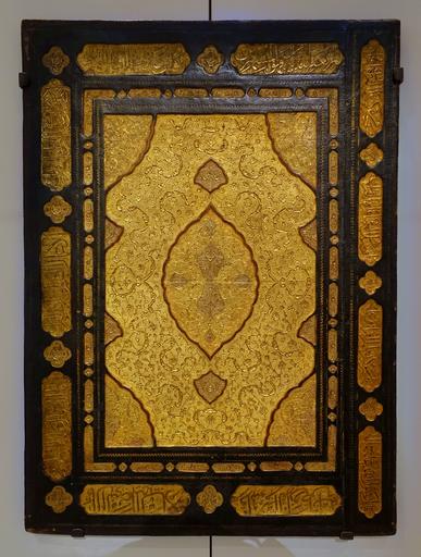 | Keywords: Qur'an binding, calligraphy by Ahmad al-Neyrizi, Iran, 1717-1718 AD, ink, color, and gold on paper - Aga Khan Museum - Toronto, Canada - DSC06800.jpg en Exhibit in the Aga Khan Museum - Toronto Canada This work is old enough so that it is in the public domain Photography was permitted in the museum without restriction 2015-10-06 12 27 00 own Daderot other versions PD-old-100 cc-zero Bookbinding of Iran in the Aga Khan Museum Calligraphy in the Aga Khan Museum Ahmad al-Neyrizi | ||||