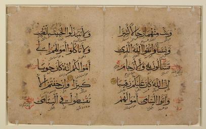 | Keywords: Qur'an manuscript Surat al-Nisa'. (2).tif Kufi letters The title is in a gold-painted rectangular band ornamented with a gold medallion outlined in blue projecting into the left margin Below the surah heading appears the first half of the first verse in large black muhaqqaq script with diagonal word-by-word translation into Persian between each horizontal line of text The right side of the folio contains the second half of the third verse of the same chapter which when folded vertically at the center with verses 1 3 included on its verso yields the first four continuous pages of text of Surat al-Nisa' Unlike similar interlinear Qur'ans that include a Persian translation in red ink this fragment makes no color differentiation between the Arabic original and its Persian rendition Diacritical marks in red appear to have been added at a later date much like the marginal glosses and corrections The fragment appears to date from the Ilkhanid period circa 1250 1350 and may have been produced in the imperial center of Tabriz in northwestern Iran The clear Arabic muhaqqaq and Persian thuluth scripts are typical of the period as are certain variants in the Persian orthography The fragment is unlike later Safavid interlinear Qur'ans where Persian translations appear in red nasta'liq script in horizontal registers Both the lack of differentiation between the color of the scripts and the absence of a frame suggest that the fragment dates from the formative years of Ilkhanid production of bilingual Arabic Persian Qur'ans A further sign of antiquity is the gold surah heading in Kufi at the top of the left folio which harks back to earlier decorative ornaments and illumination in Qur'ans of the 'Abbasid period The paper is cream-colored and the ink on the verso shows through to the recto This fragment is of particular interest as it provides pronunciation directions in the margins These glosses instruct the reader how to read properly and highlight the oral nature of the Qur'an کوفی و درشت و به رنگ طلایی نوشته شده است عنوان در مستطیلی طلایی رنگ قرار دارد که با طرحی طلایی رنگ در سمت چپ آن و حاشیه ای آبی رنگ آراسته شده است آیات به خط محقق و مشکی رنگ و بزرگ نگاشته شده اند ترجمهٔ تحت اللفظی فارسی آن به خط ثُلُث و به صورت اُریب و با رنگ مشکی در بین آیات عربی نوشته شده است ادامهٔ آیات در سمت راست صفحه نوشته شده است بر خلاف دیگر قرآن های دست نویسی که ترجمهٔ فارسی آن ها به رنگ قرمز است، در این دست نوشته ترجمهٔ فارسی هم رنگ آیات عربی است نشانه ها و حاشیه های سرخ رنگ ظاهراً بعدتر به اثر افزوده شده اند اثر مربوط به دورهٔ ایلخانیان ۶۵۴-۷۵۰ ه ق معادل ۱۲۵۶-۱۳۳۵ م و احتمالاً در تبریز پایتخت ایلخانان نگاشته شده است در آن دوران خط عربی محقق و خط پارسی ثلث رایج بوده است در دست نوشته های دوران صفوی، بر خلاف این دست نوشته، ترجمهٔ فارسی به خط نستعلیق و سرخ رنگ و به صورت افقی نگاشته می شدند نبود تفاوت میان رنگ ترجمه فارسی و آیات عربی و نیز نبود قاب نشان می دهد اثر مربوط به دوران ایلخانیان است عنوان طلایی رنگ از دیگر نشانه های قدمت این اثر است که به تزئیناتی که در دورهٔ عباسیان در قرآن ها انجام می شده است برمی گردد صفحه کرم رنگ و با ابعاد ۳۱٫۹ در ۱۹٫۵ سانتی متر است و جوهر نوشته های پشت صفحه از طرف دیگر دیده می شود در حاشیه توضیحاتی برای درست خوانی آیات آمده است ar تحتوي الصفحة اليمنى من هذه الرقعة على أجزاء من أول ثلاث آيات من السورة الرابعة من القرآن الكريم، ألا وهي سورة النساء وفي أعلى الجانب الأيسر من الصحيفة، يوجد عنوان السورة وعدد آياتها 176 بحروف كوفية ذهبية سميكة والعنوان موجود داخل شريط مستطيل مطلي بالذهب، تزينه ميدالية ذهبية بارزة باللون الأزرق وتنتأ إلى داخل الهامش الأيسر وأسفل عنوان السورة يظهر النصف الأول من الآية الأولى بخط مُحَقَّق أسود كبير، مع ترجمة مائلة كلمة بكلمة إلى الفارسية مكتوبة بين كل سطر نص أفقي وآخر ويحتوي الجانب الأيمن من الورقة المطوية على النصف الثاني من الآية الثالثة من نفس السورة، وعندما يتم لف هذا النصف رأسيًا عند المنتصف، بحيث تكون الآيات من 1 إلى 3 موجودة بالصفحة اليسرى، يكون الناتج ظهور اول أربع صفحات من نص سورة النساء وبخلاف نسخ القرآن الشبيهة التي تحتوي فيما بين سطورها ترجمة إلى الفارسية مكتوبة بالحبر الأحمر، فإن هذه الرقعة لا تحتوي على أي تمييز لوني بين الأصل العربي وترجمته الفارسية ويبدو أن علامات الإعراب الحمراء قد أُضيفت في تاريخ لاحق، وهي في ذلك تشبه كثيرًا المسارد والتعليقات الهامشية ويبدو أن تاريخ الرقعة يعود إلى عصر الخان حوالي 1250 1350 و